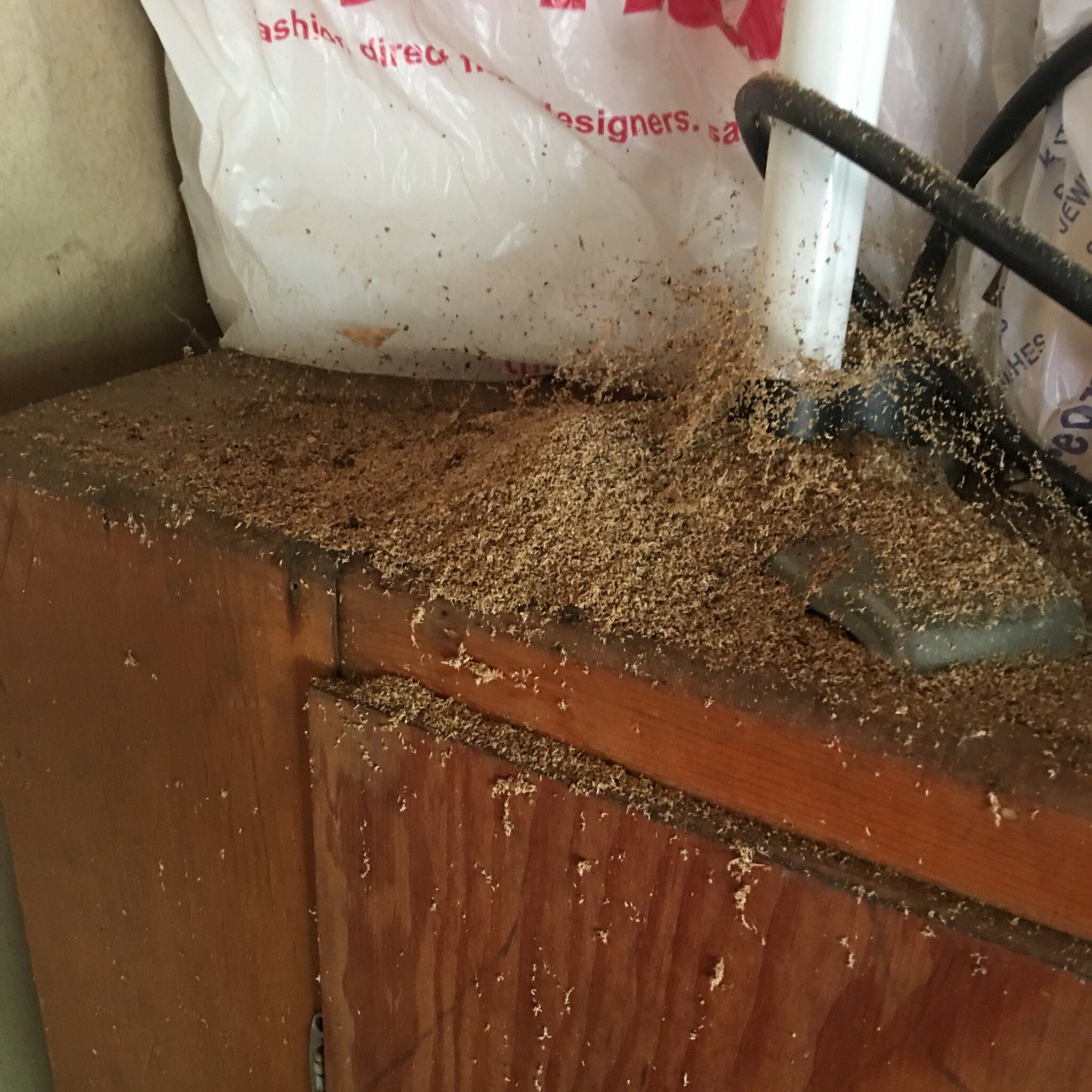Frass may be found in crawl spaces around your home in basement areas, garage spaces, window sills, decks, and secluded locations. It may be stuck to the walls underneath the kickout holes or piled up on surfaces.