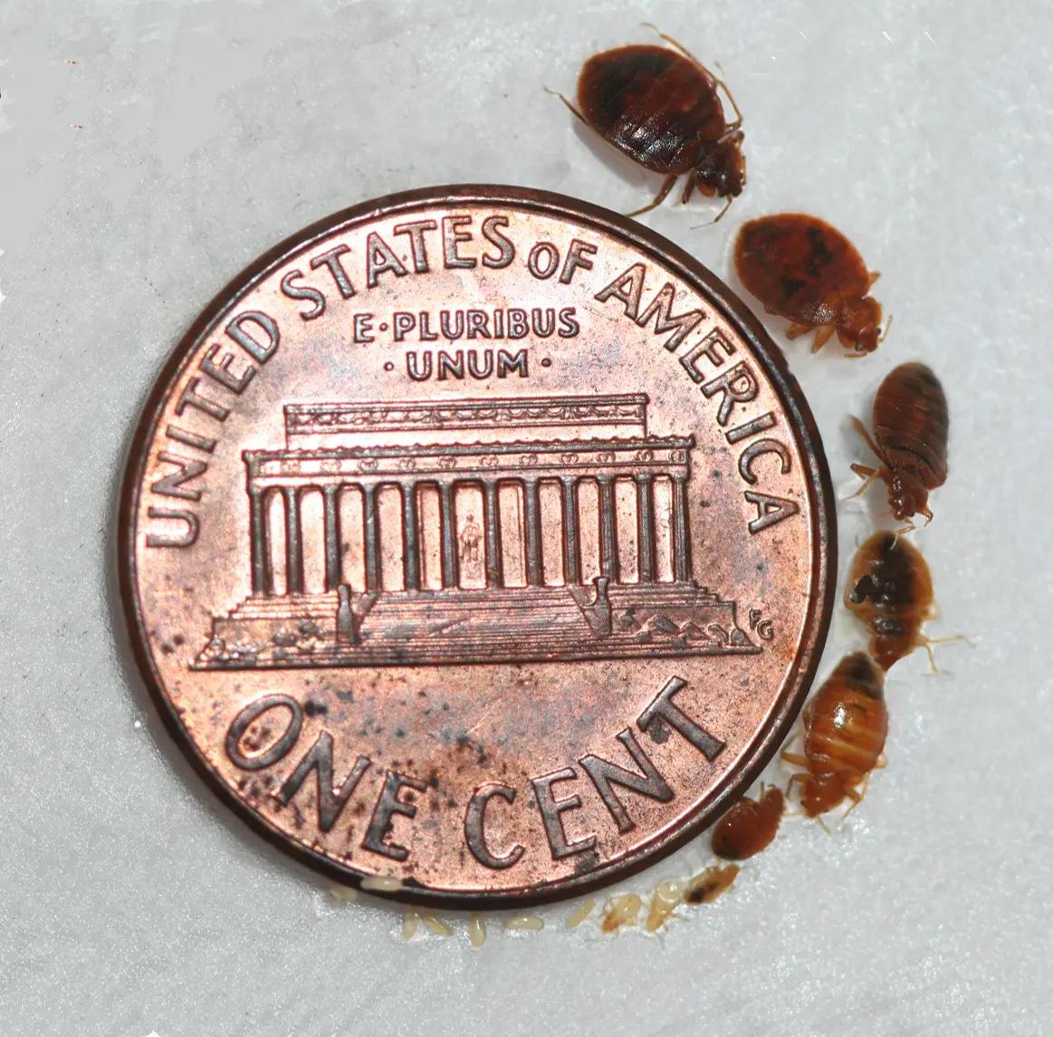 This is a picture of bed bugs with a penny for size reference.