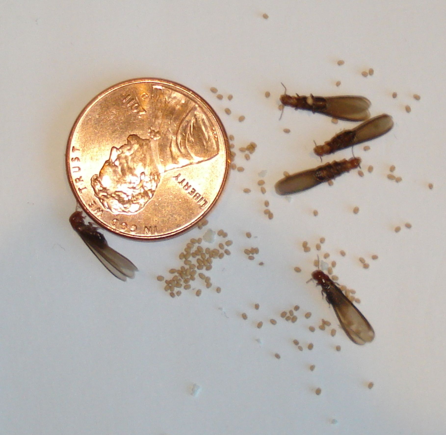 - Winged swarmers or discarded wings — often seen indoors in spring; termites have equal-length wings (vs. ants, which have unequal).