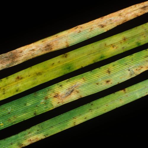 Both diseases first appear as an irregular pattern of off-color spots. The infected area can be several inches to several feet in diameter. An entire lawn can become infected. Close inspection of infected grass blades reveals dark green spots. These lesions eventually turn purple/brown. Multiple lesions on a blade often cause the grass blade to die. Once the infection reaches the crown and roots, the entire plant will die.